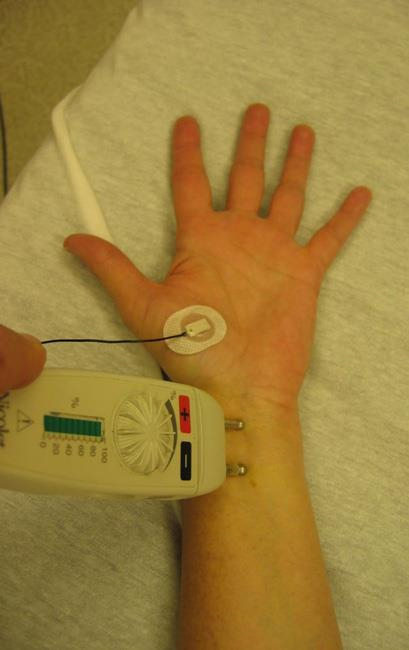 Close up of an EMG being performed with a nerve conduction study.