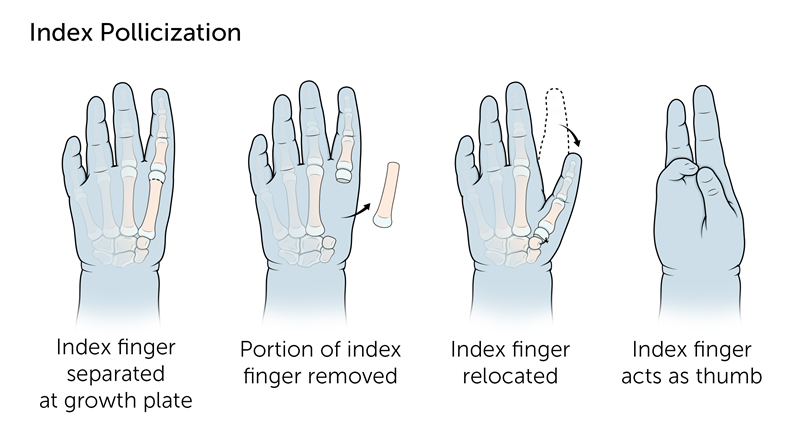 This surgery may be an option if your child has no thumb or severe hypoplasia. The operation involves creating a functional thumb by transferring another finger (usually the index finger) to the thumb position.